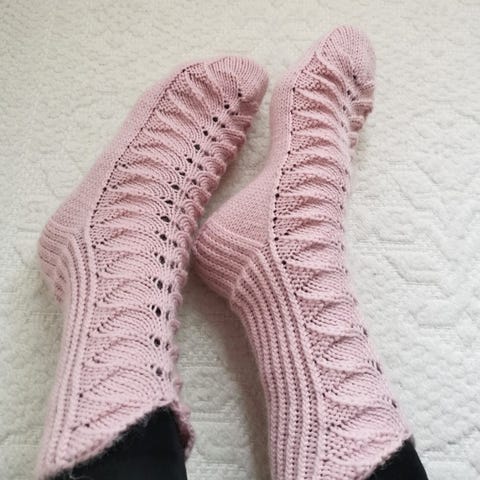 Sukat on neulottu Kotikulta langasta, 75 % villaa ja 25 % polyamidia, ovat kokoa 38 - 39. Terän pituus 24.5 cm ja varren pituus 19 cm ennen kantapäätä.