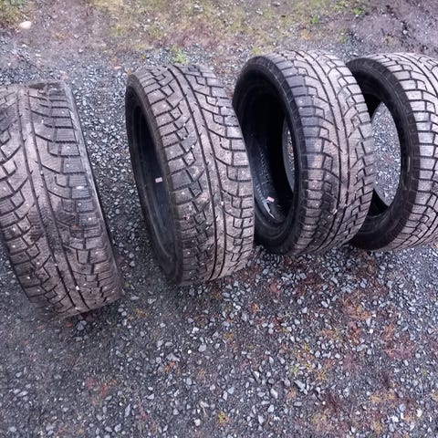 Nokian Hakkapeliitta 7, DOT3612 ja painoluokka 97. Nastoja poikki, tarvittaessa laitan parempia kuvia. Kulutuspintaa n.5mm.
