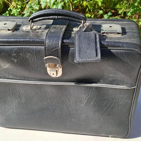 Aito lentäjän laukku. Ostin sen joku vuosi sitten Finnairin lentäjältä. Laukku on on nähnyt maailmaa, käytönjälkiä on jonkin verran ja Finnarin ja Iatan tarroista jäänyt liimapintaa.