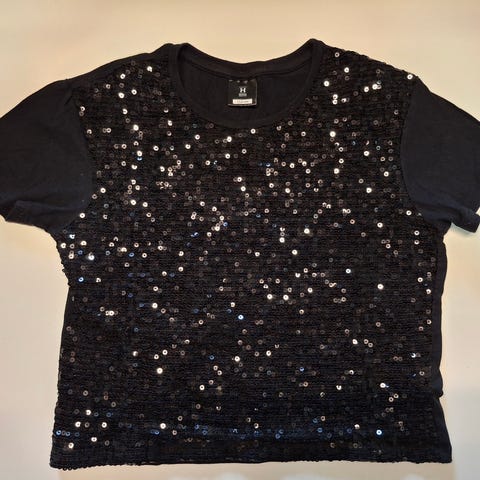 Paljettipaita (ohuempaa matskua, ei gollege) koko 152cm. Siisti käytetty kunto, ei kotieläimiä.