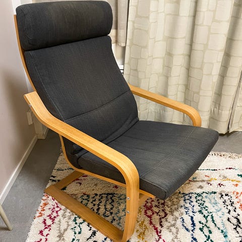 Vuoden vanha Ikean mukava nojatuoli. Puuosat tammiviilutettu ja kankaan väri Gunnared beige.