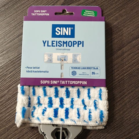 Ehjä ja siisti taittomoppi, teleskooppivarsi ja mikrokuituinen pestävä moppausliina. Mukana myös sankoon kiinnitettävä puristin. Sanko puuttuu. Kaikki yhteensä 15€ (uutena n. 50€).