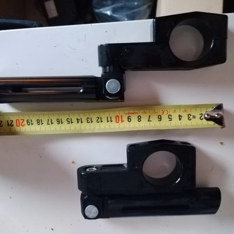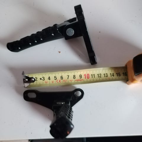 Mustat metalliset jalkatapit, joiden mitat näkyvät kuvissa mittanauhan avulla. Sopivat esimerkiksi moottoripyörän tai muun ajoneuvon jalustaksi.
