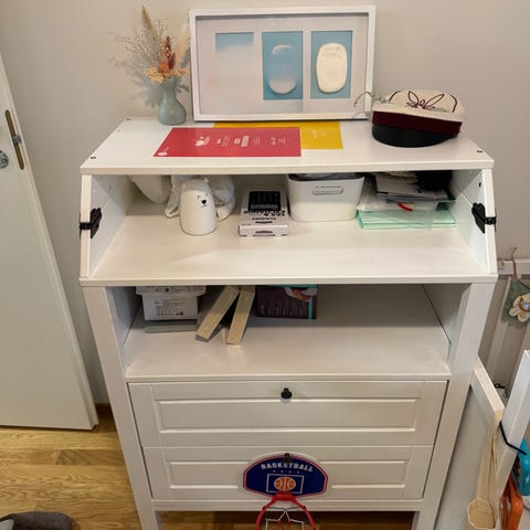 Ok, käytetty kunto. Pientä tahraa voi löytyä. Puunvärisessä kirjoitustasossa kaksi valkoista kynsilakkatahraa, jotka lähtevät kynsilakanpoistoaineella, meillä ei sattumoisin sitä ollut, joten en saanut poistettua niitä. Myydään muuton vuoksi.