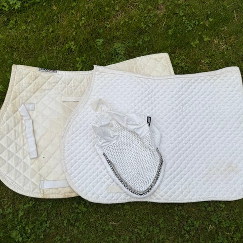 Kaikki 7 satulahuopaa samassa paketissa. Tummanruskeassa ja beigessä huovissa Suomenratsujen brodeeraukset, myös vihreässä, joka jo rispaantunut reunoista. Kolme mustaa Horzen, joista yhdestä lähtenyt väriä. Katso kuvat. Viininpunainen ohut huopa, muissa jonkinlainen täyte/tikkaus, pehmuste sisällä.