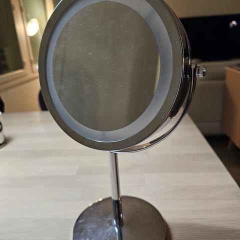 Meikkipeili valoilla.Himmennys ja eri värejä valoissa.Koko korkeus 30cm ja leveys 20cm. Toimii paristoilla ja johdolla