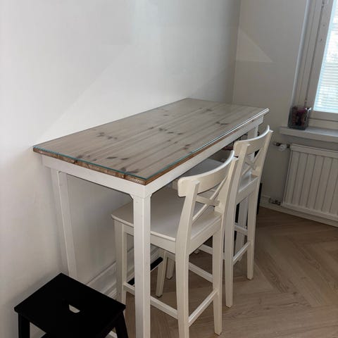 Myydään kaksi siistiä ja hyväkuntoista baarituolia. Settiin kuuluu myös kuvassa näkyvä pöytä. Vaalea, helppohoitoinen verhoilu ja tukevat kromijalat tekevät näistä ajattomat ja tyylikkäät moneen keittiöön tai baaritasolle. Eivät nitise tai keiku, istuin on napakka ja ryhdikäs. Ei repeämiä tai selviä tahroja, yleisilme todella siisti tuoleissa. Pöydässä on kuvassa näkyvä lohkeama.