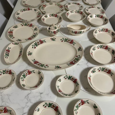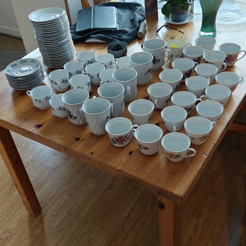 44 vuotta vanhat 6 kuppia, lautaset ja kakkulautaset.