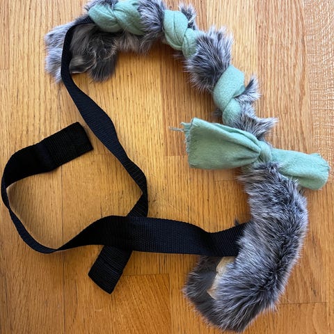 Kierrätysmateriaaleista tehty kaninkarva vetolelu. N. 40cm plus mustat narut mistä saa pidettyä kiinni. Karva/nahka käsitelty ilman myrkkyjä ja karva/nahka itse eettisesti kasvatettua.