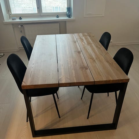 Valkea puinen ruokapöytä, jossa on kolme lankkua ja ristikkäiset tukirakenteet. Mukana kuusi valkoista muovituolia, joissa on puiset jalat. Sopii ruokailutilaan tai muuhun oleskelutilaan. Tykätty ja pidetty, mutta nyt muuton alta pois. Ei mahdu uuteen kotiin :(