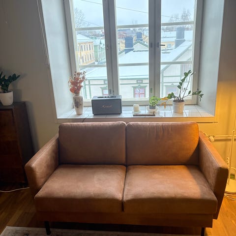 Sohva, 2 kpl nojatuolit, lasipöytä