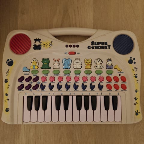Yhden lapsen käytössä ollut toimiva Simba-merkkinen kosketinsoitin. Paristoissa tuntui olevan vielä potkua, joten pääsee heti soittelemaan. Eläimetön ja savuton koti.