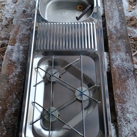 kaasugrilli kannella. Grilli on suunniteltu kannettavaksi ja soveltuu ulkokäyttöön. Varustettu kahdella polttimella ja irrotettavalla ritilällä
