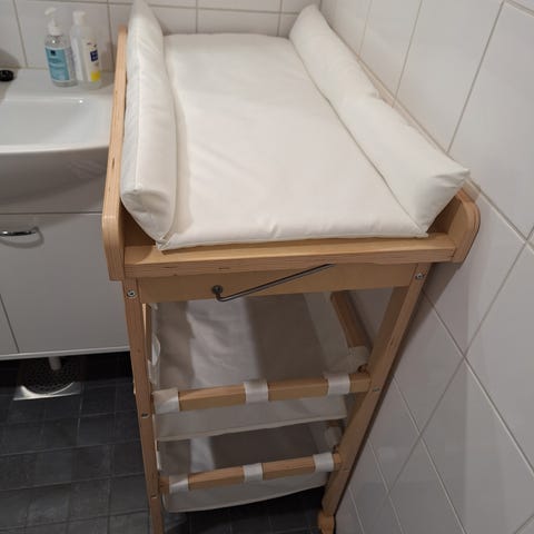 Hoitopöytä ammeella, alla renkaat joten kätevä liikutella. Ammeessa tyhjennysletku. Helppo kylvettää vauva kun ei tarvitse kyykkiä ja turvallista kun voi vaan siirtää viereen hoitotasolle. Tosi kätevä ollut meillä ensimmäiset kuukaudet jonka jälkeen käytetty vain hoitotasona. Ostettu täältä käytettynä. Alle saa hoitotarvikkeet pyyhkeet yms. Alemman korin kangas repeytynyt päädystä, ei vaikutttanut meillä käyttöön. Korkeus hoitotasoon lattiasta 94cm. Perus kulumaa löytyy. Tästä kätevä hoitotaso seuraavalle😊