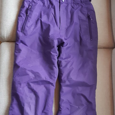 Myydään nätit violetit toppahousut henkseleillä, lahkeissa lumilukot, kokomerkintä 150. Lahkeiden alkuperäiset saumat avattu, jolla saatu hiukan (n. 2 cm) pituutta lisää.