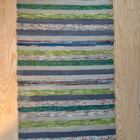 Pitkä ja kapea matto, hyvä esim kynnysmatoksi tai ikkunalaudalle. Väreinä vihreä / ruskea.
