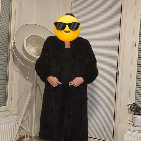 Tummanruskea minkkiturkki. Suomalaisen turkkurin valmistama.