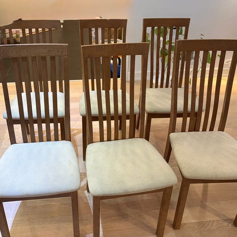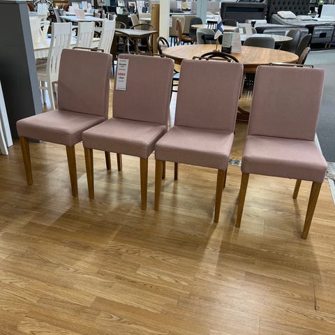 Pohjanmaan Deco ruokatuolit, materiaali vaaleaa kangasta (Viva 03). Istuinkorkeus 48 cm