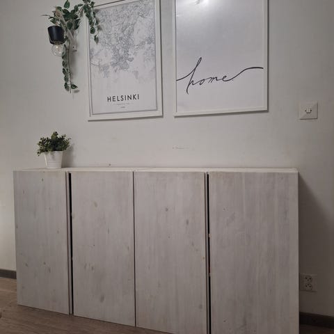 Hyvässä kunnossa oleva Ikean Ivar täyspuinen (mänty) kaappi ja hyllykkö. Itse maalattu läpikuultavan valkoiseksi. Mitat suuntaa-antavia