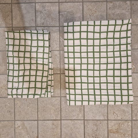 Myydään vihreä raidallinen pussilakana ja tyyny.