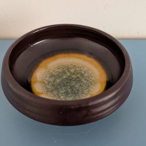 Pohjassa Kupittaan saven Piispa Henrik tarra sekä tarra jossa mallimerkintä ja värin koodinumero. Made in Finland massaleimasta pohjassa vain M-kirjain. Piispa Henrik tarra oli käytössä 1950-1960-luvuilla mutta tämä todennäköisesti valmistettu 1960-luvulla.