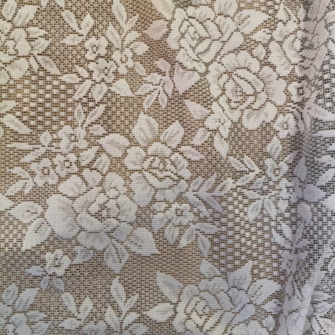Käsin kirjailtu käsipyyhetelineen suojaverho, jossa on tyttö kitara kädessä ja kukka-aiheisia koristeita. Verhossa on pitsireunus ja kirjainyhdistelmä AM. Väri valkoinen, materiaali kangas.