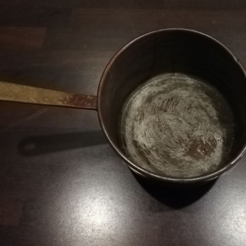 Myydään Skultuna 1607 kruunuleimattu kuparikattila kahvalla 2 l. Kattilan halkaisija on 16 cm ja korkeus on 11 cm. Kahvan pituus on 14 cm. Kuparikattilan ulkopinta on lakattu noin 40 vuotta sitten tummumisen ja hapettumisen estämiseksi. Kuparikattilan sisäpuoli on käsittelemätön, joten se on vihertynyt ja tummunut vuosikymmenten patinoimana. Kattilan kunto on hyvä sen ikä huomioon ottaen. Tämä Ruotsissa valmistettu antiikkinen kuparikattila on peräisin joko 1800-luvun loppupuolelta tai 1900-luvun alkupuolelta.