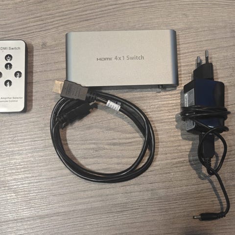 Extron SW4 HDMI -kytkin, jossa on neljä HDMI-tuloa ja yksi lähtö. Laite mahdollistaa useiden HDMI-lähteiden hallinnan yhdellä kytkimellä. Mukana virtalähde.