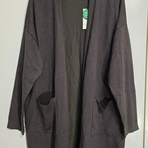 Tummanvihreä 100% merinovillainen neuletakki. Erittäin siisti, ei käytön jälkiä. Edessä taskut, ei nappeja. Pituus noin 97 cm.