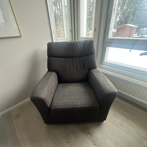 Ruskea, nahkainen nojatuoli. 2 kiinteää jalkaa ja 2 pyörillä. Kaipaa vähän siistimistä ja pinnan fixaamista, mutta runko on ehjä, samoin jalat. Istuintyyny on irrallinen ja tästä on napit irronneet aikanaan. Todella hyvä istua. Vain nouto.