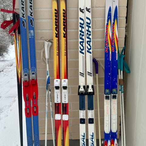 Karhu sukset ja sauvat. Sukset ovat valkoiset ja mustat, sauvojen kahvat ovat vaaleanpunaiset. Sopii hiihtoon.mielellään nouto