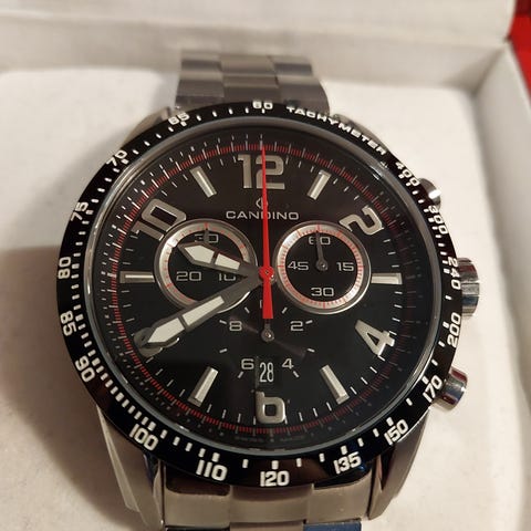 Väritys: Musta kellotaulu, jossa on hopeanväriset indeksit ja osoittimet
