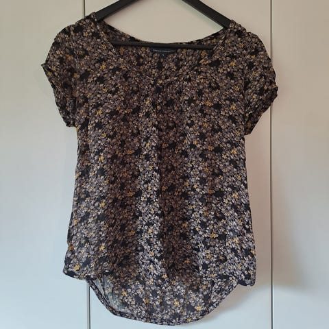 Hyväkuntoinen paisley / kukkakuvioinen juhlava paita. Sifonkia, ohutta harsomaista kangasta, kevyt ja laskeutuva. Lyhythihainen, sydämen mallinen kaula-aukko. Ruskea vuori.