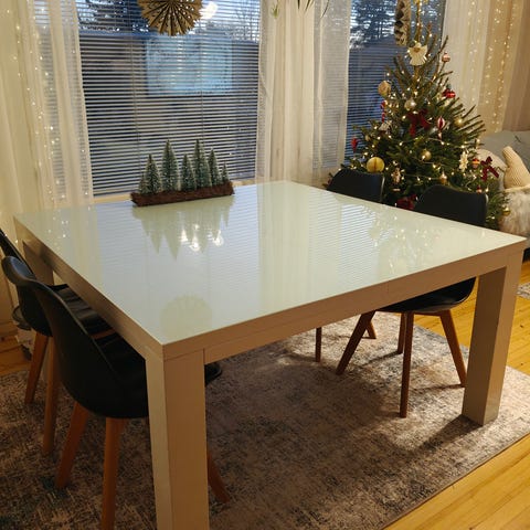 Nyt myyntiin meille tarpeettomaksi jäänyt valkoinen 8 hengen Pohjanmaan Kalusteen ruokapöytä. Pöytä on yleisilmeeltään siisti, käytönjälkiä varmasti löytyy, kuten pöydän jaloissa. Pöytä on ollut suojattuna lasilevyllä, jonka saa halutessaan kaupanpäälle. Lasi ottanut muutaman kolhun reunoista, mutta ei ole meillä haitannut käyttöä. Pöytä on neliön mallinen ja todella tukeva.