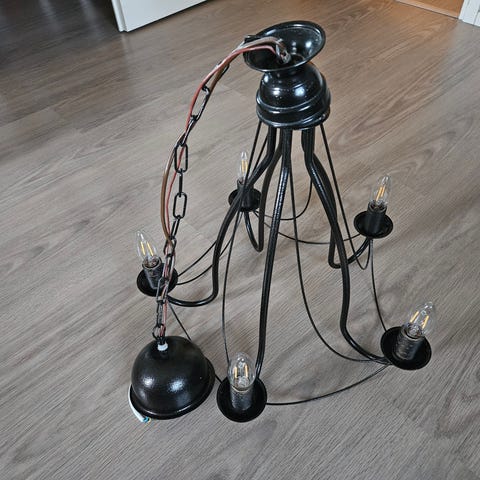 Kaunis kattokruunu, jossa on viisi valaisinta ja kristallikoristeita. Sopii sisätiloihin valaisemaan ja koristeeksi. Valaisimen korkeus n. 50 cm, ilman ketjua.