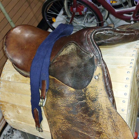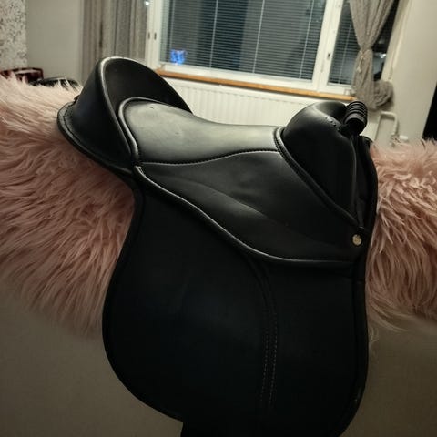 Ponisatulapaketti. Mukaan kuuluu satula, jalustimet ja satulahuopa. Käytetty vain puuhevosella.
