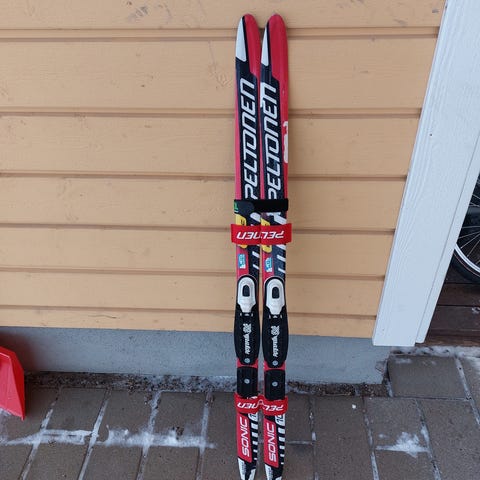 Myydään Peltonen sukset 100cm ja sauvat 75cm. Kiinnitys omiin kenkiin, side säädettävissä. Hyväkuntoiset, yhdellä lapsella käytössä olleet.