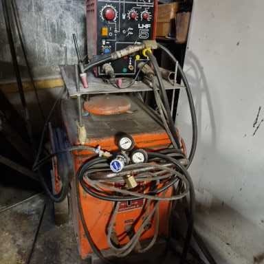 Jämäkkä kärry hitsauskoneelle ja kaasupullolle. Kärryssä ollut Kemppi master 1500tig.