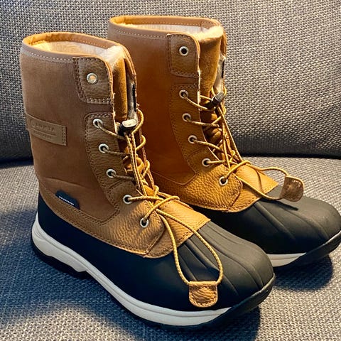 Lämpimät Luhdan talvikengät. Ehjät ja siistissä kunnossa. En ole yrittänyt puhdistaa kärjissä olevia hiukan tummempia jälkiä.
