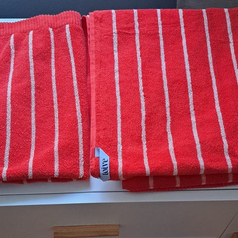 Käytössä olleita pyyhkeitä. Ryppyisyyttä säilytyksen jäljiltä. Tahroja en näistä löytänyt. Käyttökulumaa näkyy jo reilummin, etenkin L.O.L. pyyhkeessä (L.O.L. pyyhkeen kunto tyydyttävä). Yksiväriset pinkit pyyhkeet (pinkit pyyhkeet kunto hyvä) ovat olleet vähemmällä käytöllä. Pyyhkeiden pinta karheampi, ei enää pehmeä, kuin uutena. L.O.L.- pyyhkeen pinnassa kulumaa kauttaaltaan. Katso esimerkit kuvista. L.O.L.-pyyhkeen kulumien / vikojen vuoksi laitoin kunnoksi tyydyttävä.