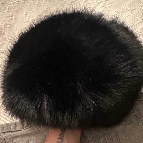 Kauniin vihreä, lämmin huppu karvareunalla. Ei materiaalimerkintöjä joten en osaa varmaksi sanoa onko turkis aitoa vai ei.