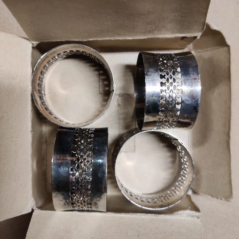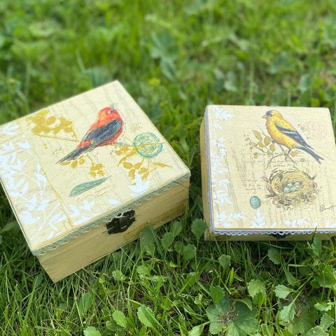 Kauniit käsin koristellut puurasia-aarteet, joihin on käytetty servettitekniikkaa ja pitsikoristelua.