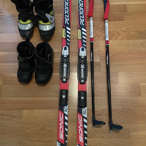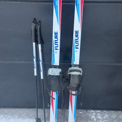 Kohtalaisessa kunnossa olevat lasten 100 cm sukset ja 80 cm sauvat. Siteet remmikiinnityksellä normikenkiin ja yksi hihna on matkan varrella uusittu erilaisiksi. Näkyy kuvassa. Lukkolaitteet tuntuvat pitäviltä, mutta asia selviää kunnolla vain käytössä. Sukset olleet useita vuosia varastossa.