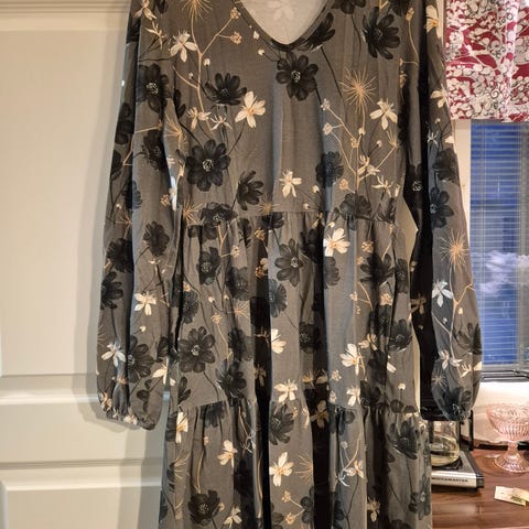 Vain sovitettu versonpuodin mekko. Ei ole pesty eikä käytetty. Koko L. Puolikellohelma, taskut. Mummola kuosi. Malli ehkä Silvia. Mustanharmalla pohjalla sinisiä kuvioita. polvipituinen.