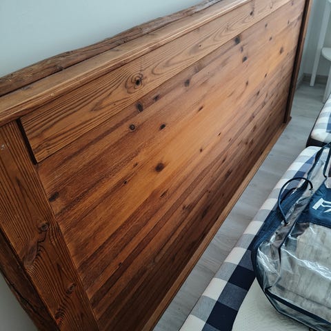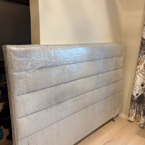 Myyntiin uusi ja upea sängynpääty, joka on verhoiltu miellyttävän tuntuisella ja sileällä vaaleanbeigellä samettikankaalla.