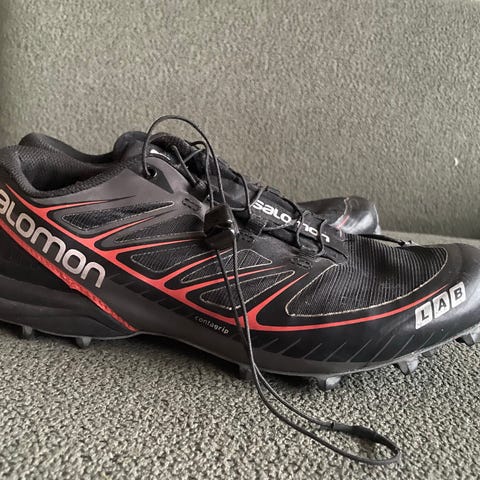Salomonin maastojuoksukengät koko 40 2/3. Paljon käytetyt, mutta edelleen köyttökuntoiset. Kuvista näkyy, että kulumaa on kengän sisällä sekä ulkoa, mutta kenkä ulkonaisesti siisti ja juuri pesty.