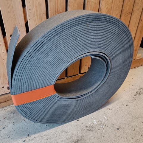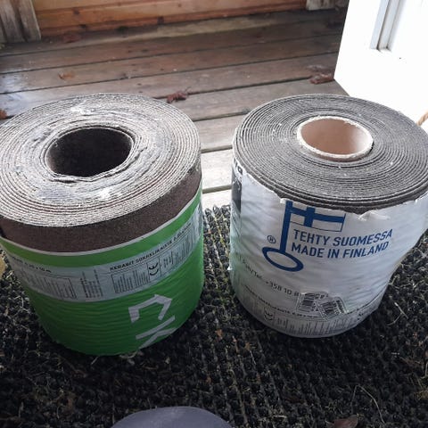 Kaksi hieman vajaata rullaa bitumi sokkelikaistaletta.