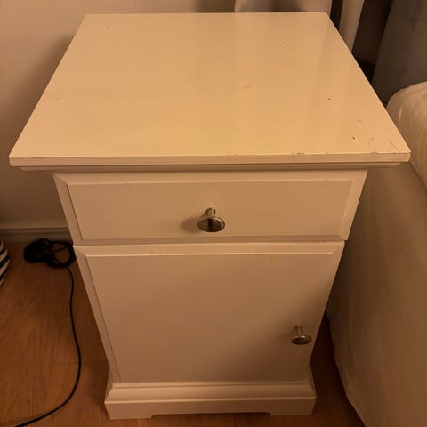 Ok kuntoinen mustanruskea Ikea Kullen yöpöytä. Pinnassa normaalia pientä kulumaa ja toisessa kyljessä on syvempiä naarmuja, mitkä näkyvät kolmannessa kuvassa. Tuota yhtä sivua lukuunottamatta yleisilmeeltään yhä siisti.
