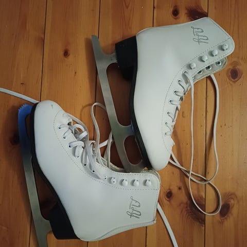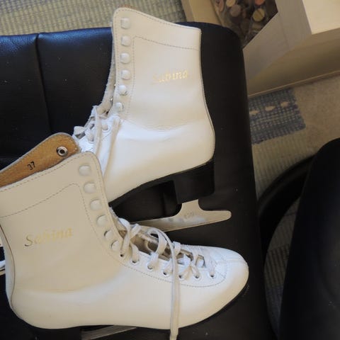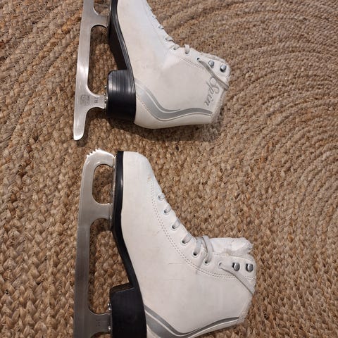 Kauni luistimet, koko 38. Väri valkoinen. Käytetty ja vanhat. Värjäytyneet nauhat, ei pesty. Jälkiä luistimessa, ei yritetty puhdistaa.