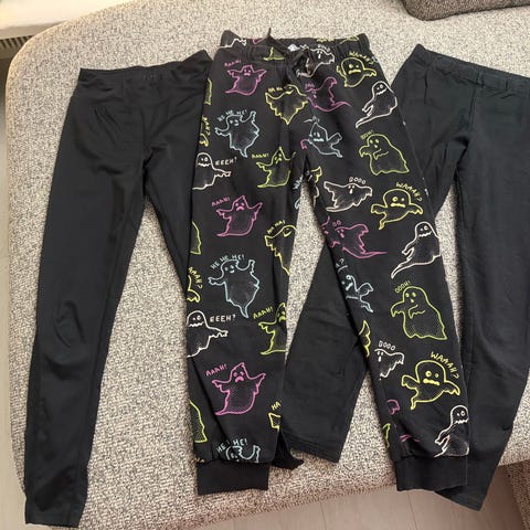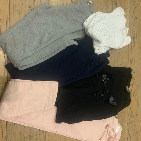 Neulemekossa keltainen jälki hihassa, pupumwkossa tummentumaa hihansuissa, housut harmaat me€Ai, housut vihreät legginssit me&I, erikseen 1-4€ kpl